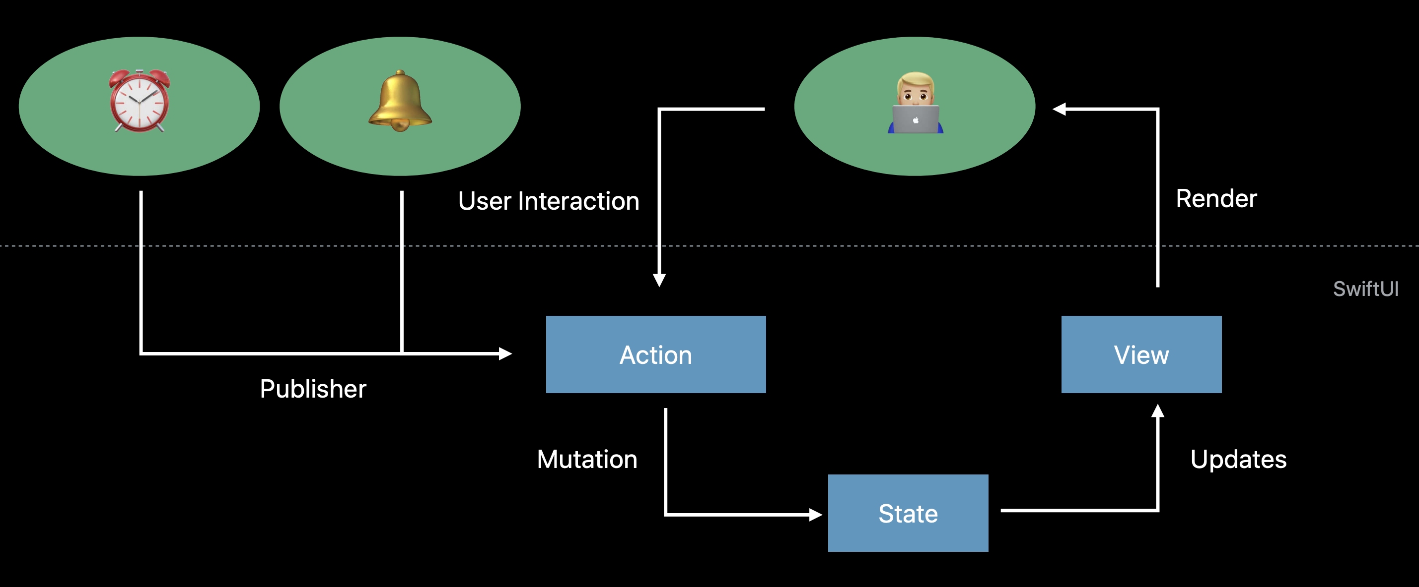 이처럼 SwiftUI에서는 외부 이벤트라도 결국은 State의 변화로 이어진다. 즉, 앞의 예제에서 유저의 인터랙션(액션)이 발생해 State가 변경되었던 것과 결과적으로는 별반 차이가 없다.