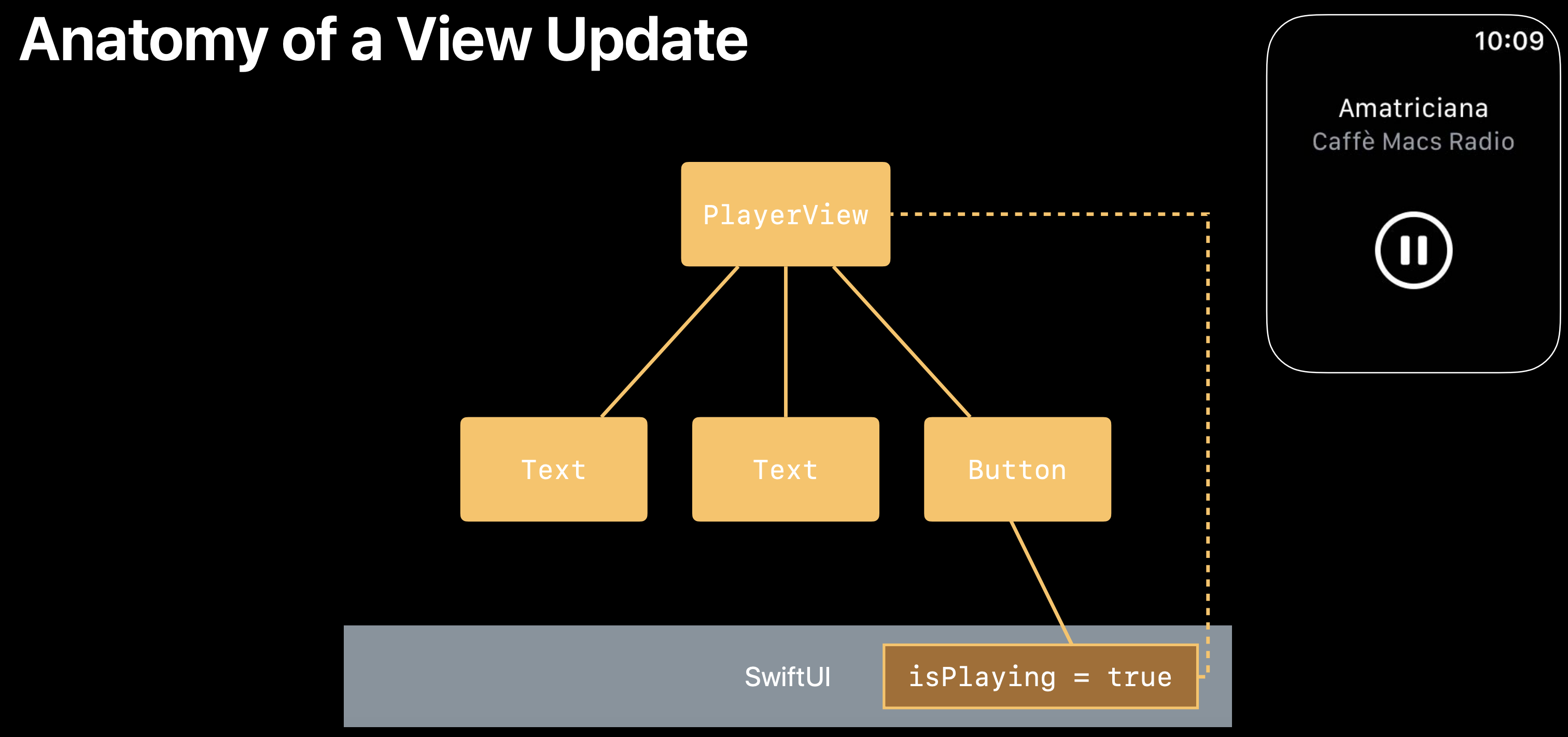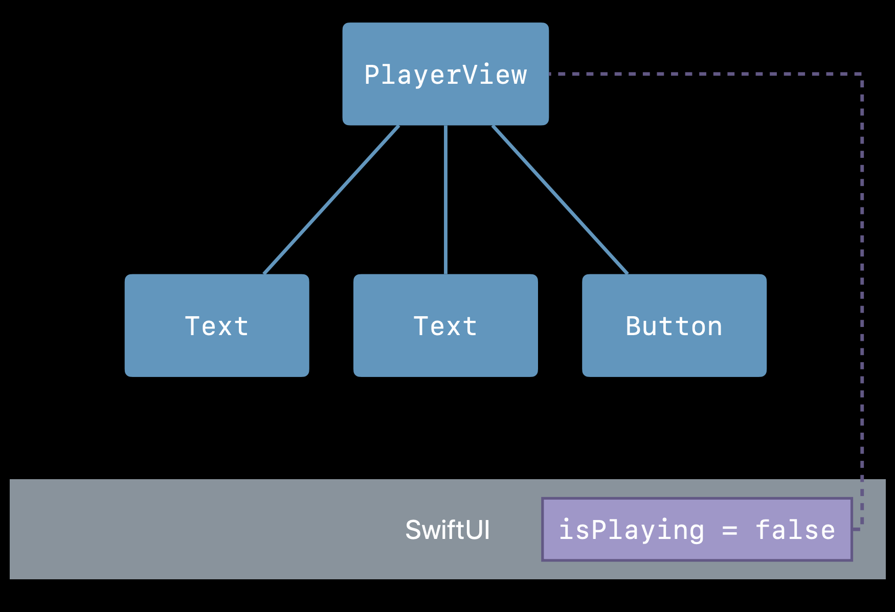 유저의 인터랙션에 따라 재생 버튼의 액션이 실행되고, isPlaying 이라는 State 변수 값이 변하고, State가 변경되었으므로 뷰 자신과 자식 뷰들의 Body가 모두 새롭게 랜더링된다. (Button > isPlaying 값 변경 > PlayerView > 자식뷰인 Text, Text, Button 에 각각 전파 > 전체적인 뷰가 갱신됨) 단, 프레임워크에서 오직 변경된 것에 대해서만 다시 렌더링해주기 때문에 이 과정은 효율적으로 수행된다.