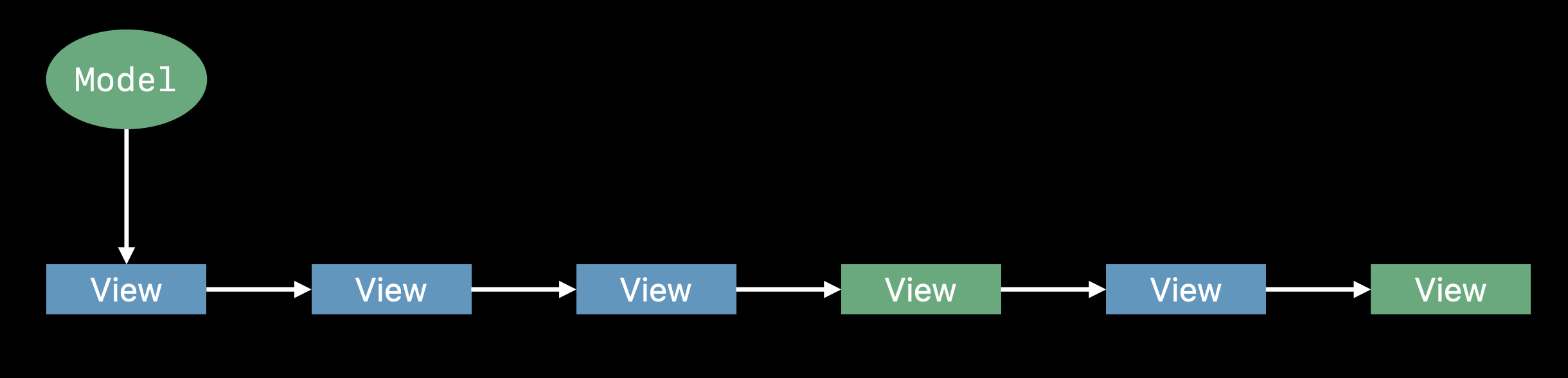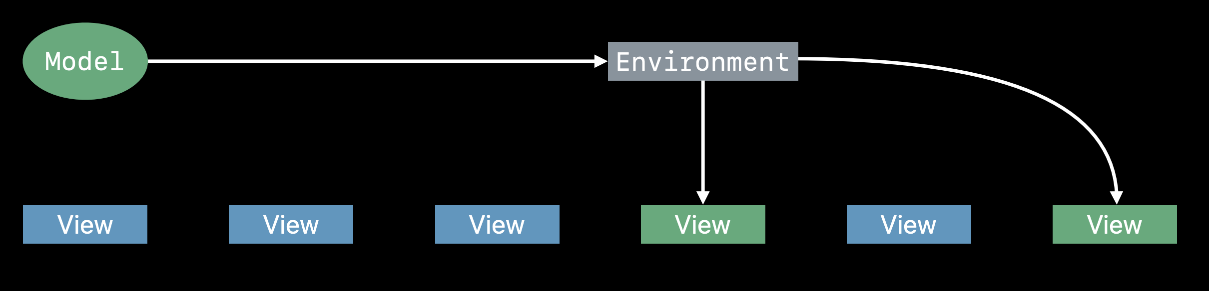 특정 모델이 변경되었을 때 초록색 뷰들이 업데이트되어야 한다면, 모델이 변경되었음을 전달하기 위해 실제로는 그 정보가 필요하지 않은 파란색 뷰들을 경유해야 할 것이다. 이런 케이스에서 EnvironmentObject를 사용하면 깔끔하게 처리할 수 있다.
