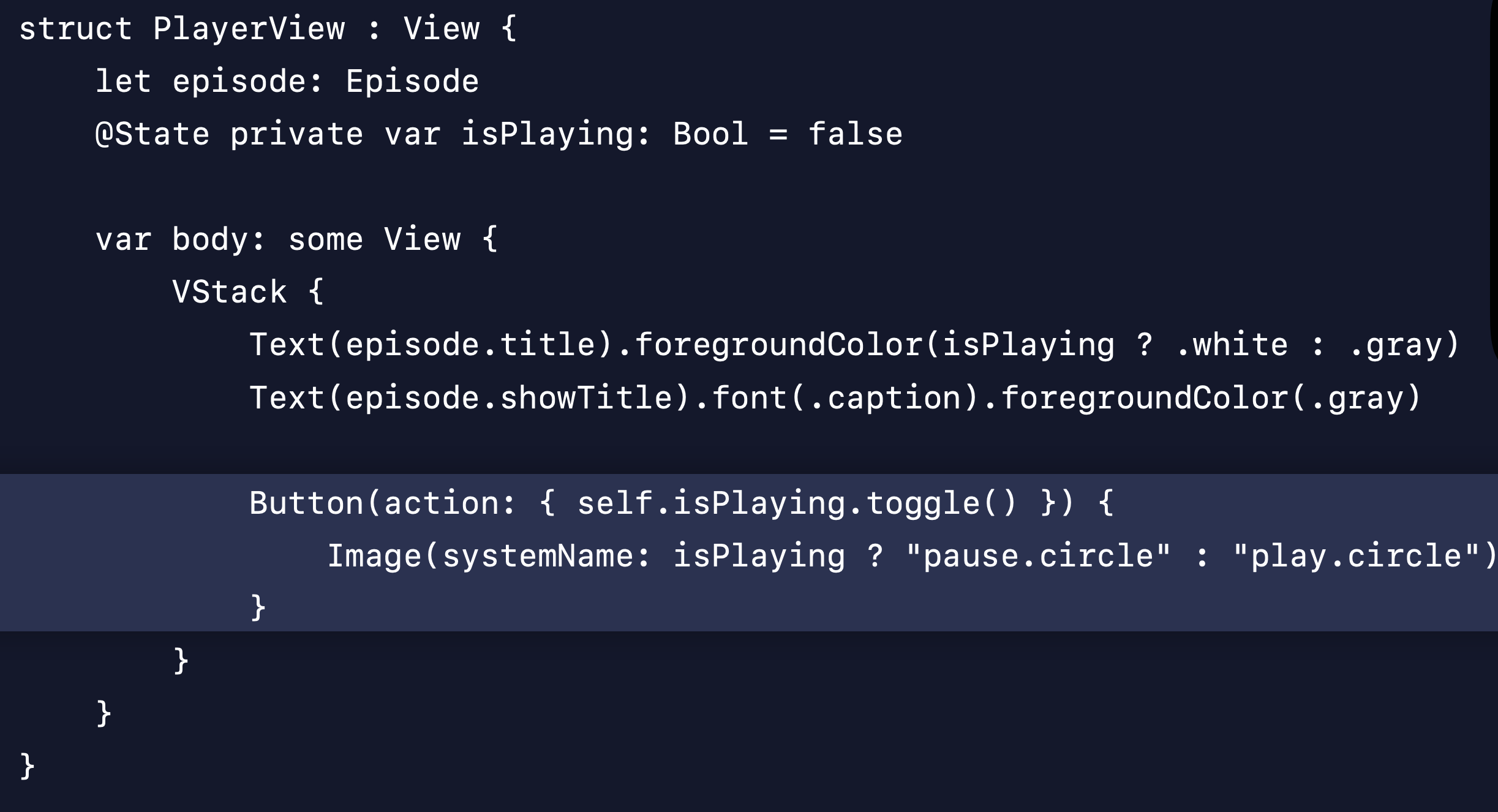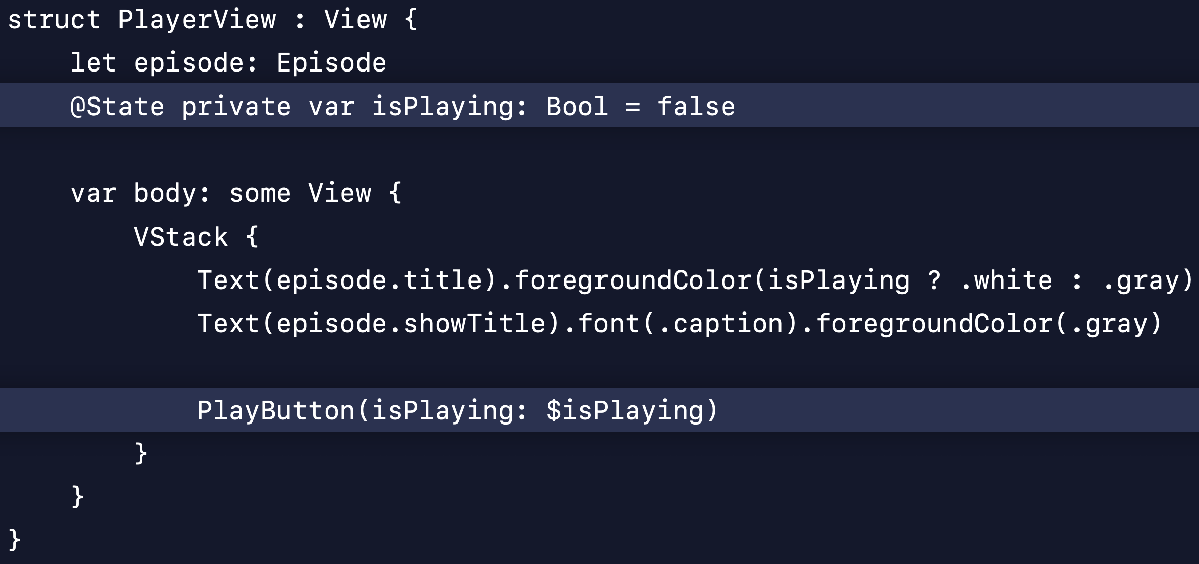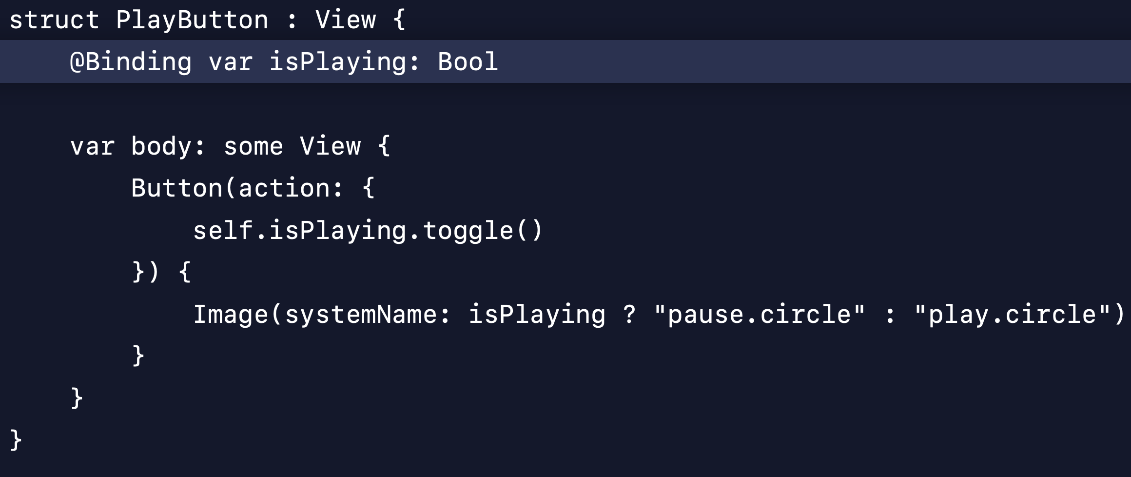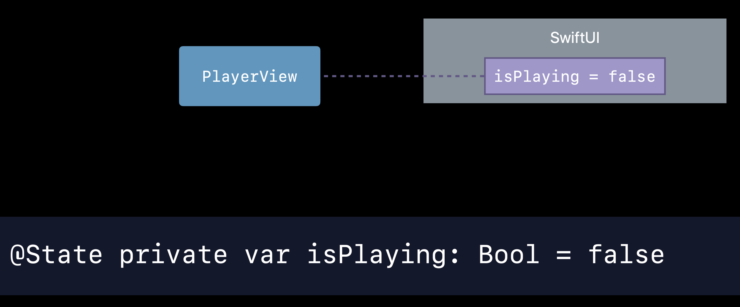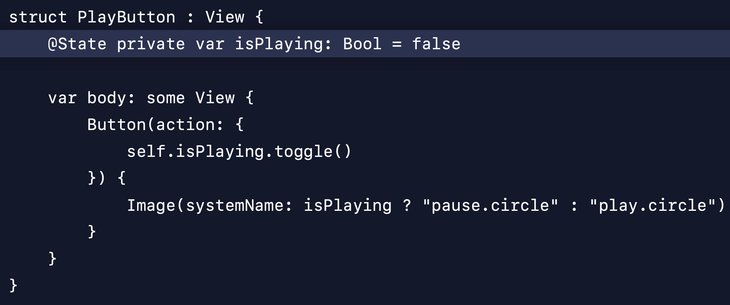 @State 를 isPlaying 프로퍼티에 붙이면, isPlaying 변수를 위한 영구적인 저장공간이 할당되며 시스템은 그것을 의존성으로서 추적한다. 일반적인 뷰는 시스템에 의해 자주 재생성되지만, @State 가 붙었다면 시스템은 같은 뷰에 여러 번 업데이트가 일어나도 이 저장공간을 계속 유지해준다. 뷰 안에서만 isPlaying 상태를 소유/관리한다는 것을 확실히 하기 위해 이 프로퍼티는 private으로 선언되었다.