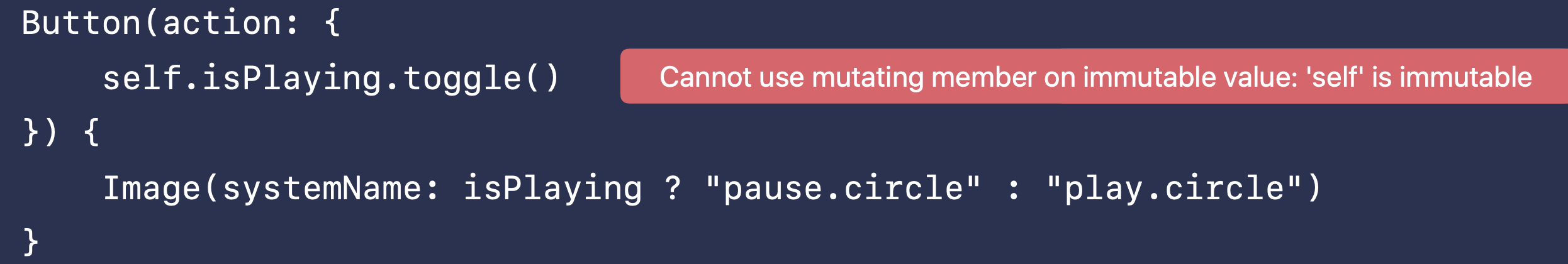 PlayerView 는 Struct, 즉 Value Type으로 선언되었기 때문에 내부 프로퍼티 값을 변경할 수 없는 것이다. 이전 이런 에러를 만나보았던 사람이라면 이때 머리에 mutating 키워드가 떠오를 것이다. Struct 등의 함수에 mutating을 명시함으로써 '이 함수 안에서는 Self의 상태가 변경될 수 있다'고 시스템에게 알려줄 수 있었다. 이와 유사하게 SwiftUI에서도 내부값 변경을 허용하게 만들 수 있는 방법을 제공한다.