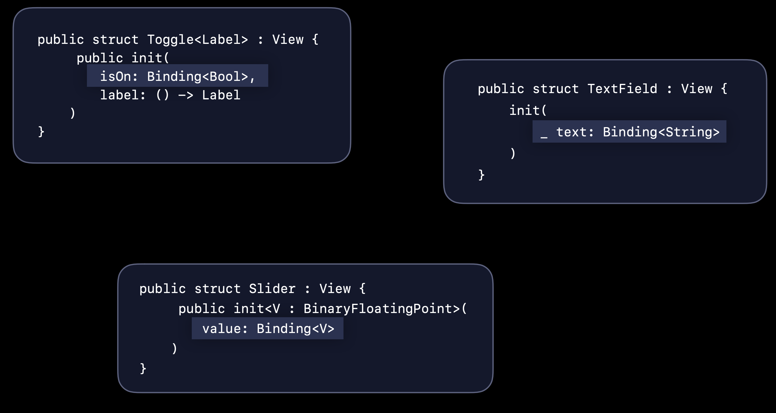 프레임워크에서 제공하는 컴포넌트에서도 바인딩을 여럿 찾아볼 수 있다. Toggle, TextField, Slider 등은 이것을 가져다 쓰는 쪽에서의 Source of truth를 유지시켜 주기 위해 바인딩으로 구현되어 있다.