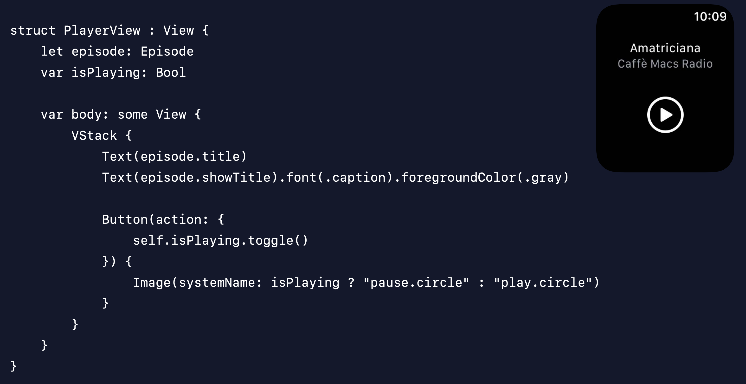 내부 프로퍼티에 @State Property Wrapper를 적용하여 '이 프로퍼티(isPlaying)의 값은 변경될 수 있으며, 이 값에 따라 Self(PlayerView)의 상태도 변경될 수 있다'고 시스템에게 알려줄 수 있다.