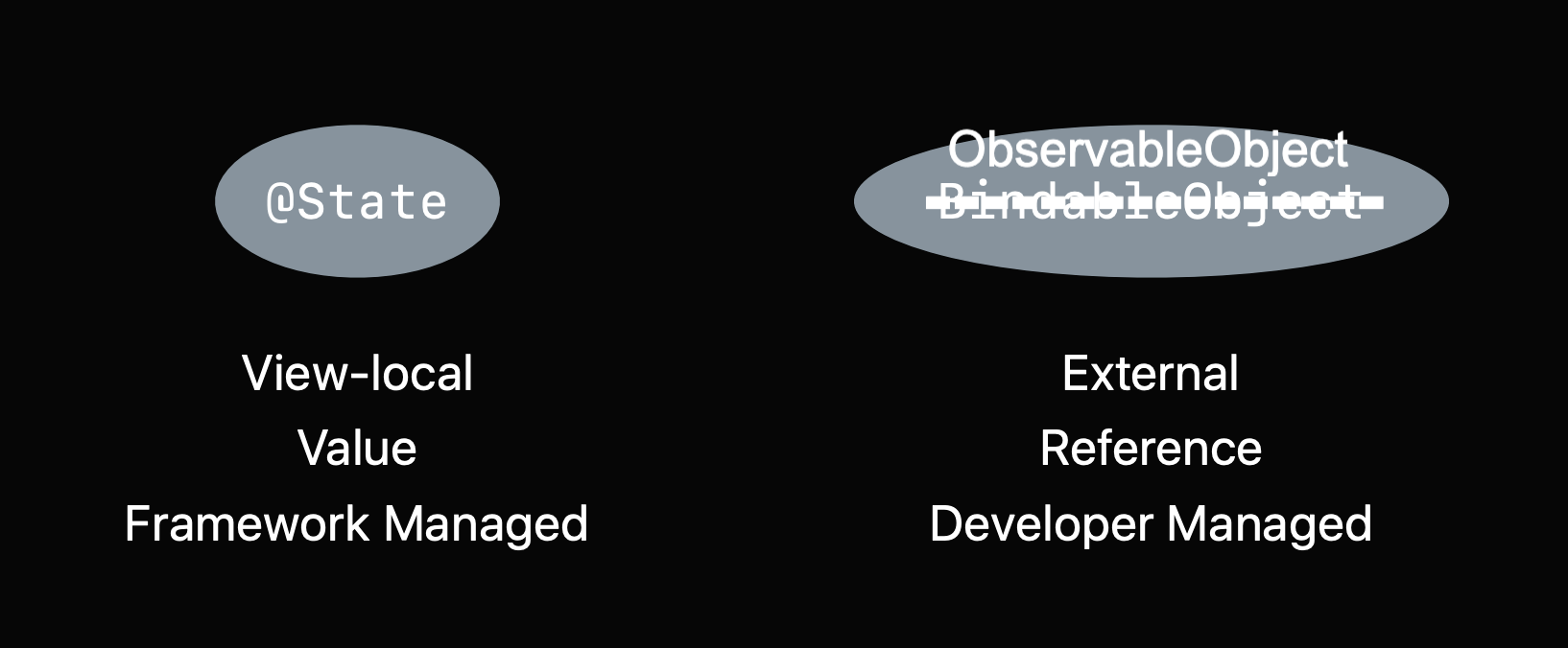 - (ex) SwiftUI 프레임워크의 Button의 highlight 여부는 Button 내부에서 @State로 관리되고 있다. Touch 중일 때 highlighted 상태, Touch가 끝났을 때 highlighted 가 아닌 상태라는 것을 외부에서 관리할 필요없이 Button 내부에서만 관리하면 되기 때문이다.